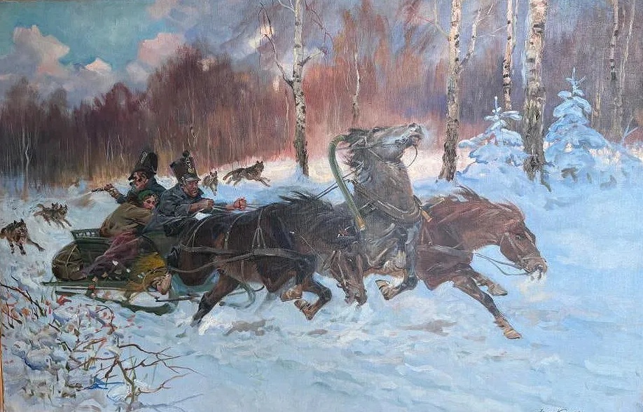 Jerzy Kossak. “Troika” sleigh being chased by wolves, 1929