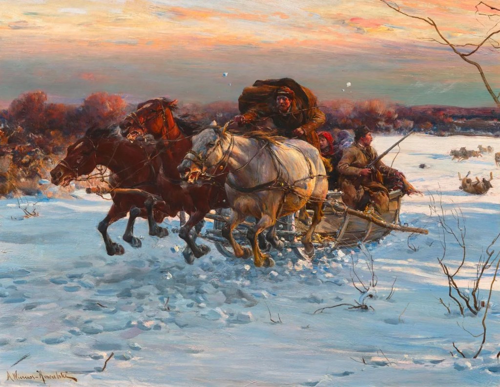 Alfred Wierusz-Kowalski. Wolves attacking a horse-drawn sleigh
