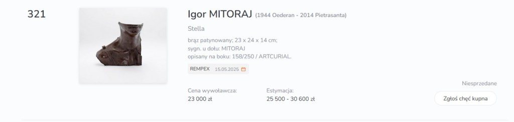 W sumie otrzymuję sporo tzw. hate mail niemal po każdym moim wpisie na temat niektórych, wykonanych w celach komercyjnych brązów Igora Mitoraja. Jest to duży biznes we Francji a jeszcze większy w Polsce i być może w jakiś sposób PAC psuje te zyskowne operacje finansowe. Ja jedynie ostrzegam, że kupienie jednego z 5,000 – 6,000 egzemplarzy tej samej rzeźby stanowi kiepski ‘interes’ dla kupującego (celowo nie nazwywam tej osoby kolekcjonerem). Obecnie, okazuje się, że nawet ilość egzemplarzy Stelli nie jest wcale zamknięta liczbą 250. Nie wiem czy wszystkie ‘serie’ mają błogosławieństwo firmy Artcurial czy też ta druga seria stanowi fałszerstwo. Mało kto się nad tym zastanawia i nie spotkałem się by te różnice były dostrzegane przez innych. Nie sugeruję, że seria bez znaku zakładu odlewniczego jest fałszerstwem bo nie wiem kto i w jaki sposób rządzi spadkiem po artyście i kto ma do niego prawa. Opierając się na tym przykładzie podwójnej numeracji Stelli należy być ostrożny w zakupach innych ‘komercyjnych’, seryjnie wykonanych prac Igora Mitoraja. Nawet w przypadku ‘krótkich’ serii rzeźb tego artysty (np. do 250 egzemplarzy), uznawanych przez niektórych za okazję kupna, można spodziewać się na kolejne ich powielanie. Przykre to.