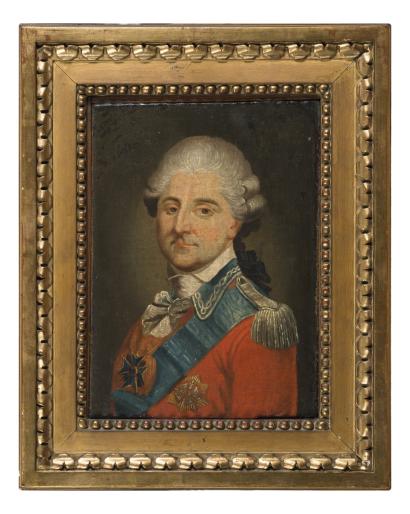 Portrait du roi Stanislas II Auguste de Pologne en buste de trois quarts tourné à gauche et en uniforme Huile sur toile Haut.: 24,7 cm – Larg.: 18 cm Cadre bois doré Stanislas II Auguste Poniatowski (1732-1798), dernier roi de Pologne, fut élu en 1764 et régna jusqu’à son abdication en 1795. Amant de Catherine II de Russie et amie de la célèbre Madame Geoffrin, passionné d’art, il fut un des plus grands collectionneurs et mécènes de l’Europe de son temps