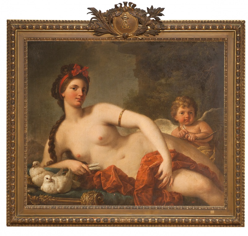 Venus Couchée des collections du roi Stanislas II Auguste de Pologne au palais Pod Blach? à Varsovie Huile sur toile Inscription: numéro d’inventaire 1265 peint en rouge en bas à droite sur la toile Cadre en bois doré au monogramme S.A.R. sous couronne pour Stanislas Augustus Haut.: 95 cm – Larg.: 114 cm Cadre en bois doré au monogramme S.A.R. sous couronne pour Stanislas Augustus Rex, soit Stanislas II Auguste roi de Pologne. Il est à noter que ce monogramme reprend exactement celui créé en 1764 par Jean-Baptiste Pillement (1728-1808) pour l’avènement du roi Stanislas Auguste.(1) Mentionnée dans le « catalogue des tableaux du roi » Stanislas Auguste, réalisé en 1795, par Marcello Bacciarelli surintendant des Bâtiments du souverain, sous le n°1265, Peschi (soit Girolamo Pesci): Vénus couchée provenant du palais Pod Blach?.(1) Elle paraît être la seule et unique oeuvre de cet artiste qui fit partie des collections du roi de Pologne. Provenance: -collection de Stanislas II Auguste Poniatowski, dernier roi de Pologne, au Palais Pod Blach? à Varsovie -collection du prince Joseph Poniatowski au Palais Pod Blach? à Varsovie -vendu en 1816 à Blazowski Le caractère totalement inédit de la découverte de la provenance de ce tableau s’avère un témoignage exceptionnel et émouvant de ce que fut la collection de peintures du roi Stanislas Auguste, une des plus importantes et parmi les plus représentatives des grands maîtres de la peinture européenne au XVIIe et au XVIIIe siècle. Un ensemble unique, constitué par un des plus grands collectionneurs de son temps, qui ne survécut pas à l’abdication du souverain en 1795 et fut livré à la vente. Le roi Stanislas II Auguste de Pologne commença sa collection dès le début de son règne en 1764, à partir de quelques dizaines de tableaux venant des collections d’Auguste II et d’Auguste III ou de ses premiers achats. Grâce à son avènement, le souverain fut en mesure de satisfaire ses propres goûts en constituant une collection royale inspirée des modèles d’autres grandes collections européennes de son temps. Un réseau d’agents artistiques fut mis en place avec des personnalités de premier plan comme Madame Geoffrin à Paris. Dès 1783, un premier inventaire des tableaux du roi répertoriait 1538 oeuvres et un second établi en 1795 en recensait 2250. Les écoles flamandes, hollandaises, allemandes, italiennes et françaises des XVIIe et XVIIIe siècles constituaient l’essentiel de la collection royale, par des achats de tableaux ou des commandes effectués par le souverain à des artistes vivants, avec pour destination les intérieurs des résidences royales comme le présent tableau dont on sait, grâce à l’inventaire de 1795, qu’il ornait les cimaises du palais Pod Blach? de Varsovie acquis par le roi Stanislas Auguste en 1776. Girolamo Pesci (1684-1759), peintre actif à Rome, élève de Carlo Maratti, il fit une partie en 1716 de la Corporation des Virtuoses. Le palais Pod Blach? de Varsovie fut acquis en 1776 par le roi Stanislas II Auguste de Pologne qui confia dès 1777 à Domenico Merlini le réaménagement de cette résidence. Le grand maréchal de la cour, Mniszech, y vécut un temps avec sa seconde femme, Ursula Zamoyska, nièce du souverain. Le prince Joseph Poniatowski, neveu du roi Stanislas Auguste, y vécut jusqu’en 1806. Le palais fut vendu en 1820 au tsar Alexandre Ier de Russie. (1) Cat. exp. L’Aigle blanc, Stanislas Auguste dernier roi de Pologne, collectionneur et mécène au siècle des lumières, musée national du château de Compiègne, 2011; Actes du colloque: L’aigle blanc, Stanislas Auguste dernier roi de Pologne, collectionneur et mécène au siècle des Lumières, Paris, 2013; T. Mankowski, 1932