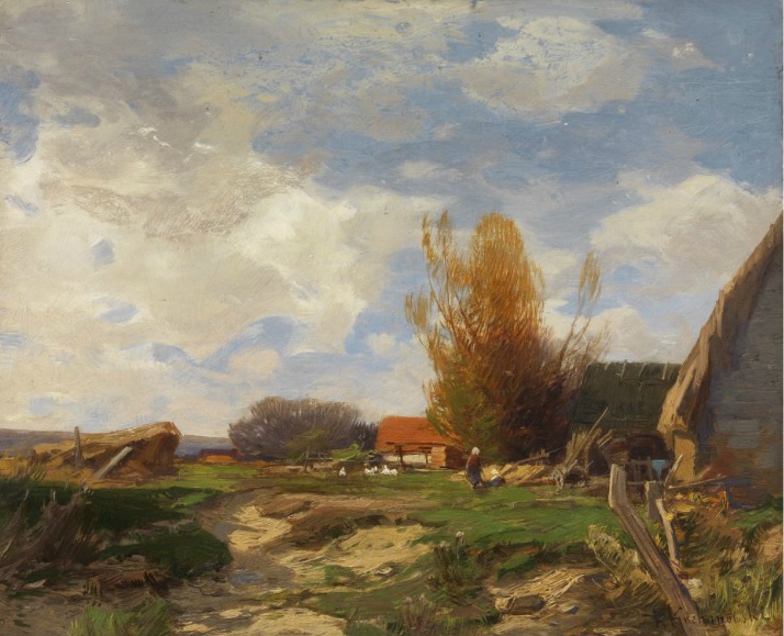 Roman Kochanowski. AUF DEM LANDE. Öl auf Malpappe. 22,5 x 27 cm. Rechts unten signiert „R. Kochanowski“.