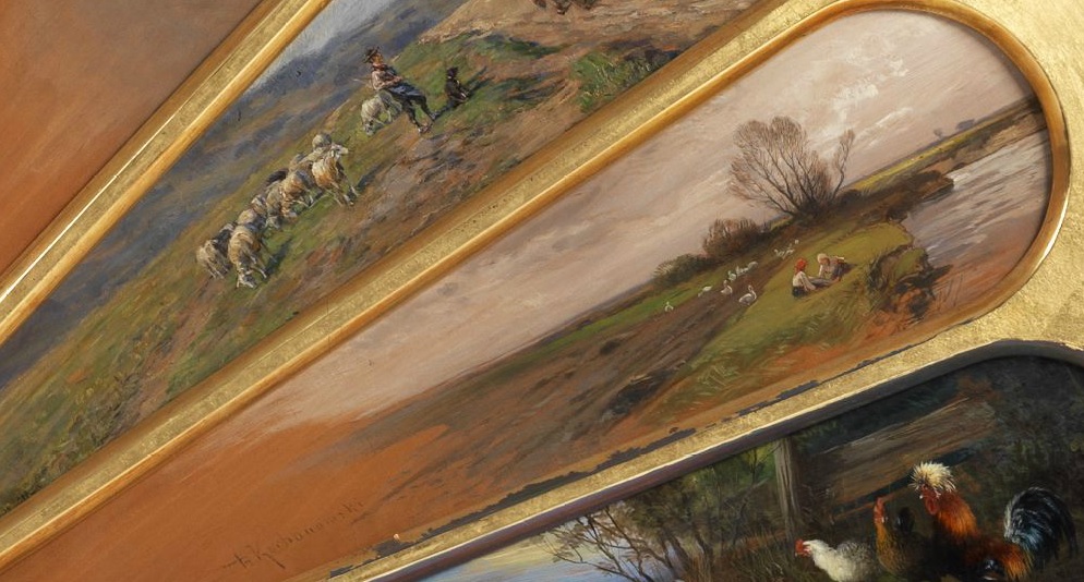 Obrazek jaki znajduje się na części wachlarza zawiera wszystkie typowe elementy jakie można wyróżnić w jego twórczości: płaski krajobraz z rzeczką, pastuszki pasące gęsi, pole i bezlistne drzewa. Sądząc po sposobie malowania i kładzenia sygnatury, obrazek Kochanowskiego powstał przed 1900 rokiem. Dodakowo, to moje przypuszczenie może potwierdzić obrazek innego autora z wachlarza, Alberta Franken-Webera przedstawiającego żabę i ważke, typowy obrazek secesji monachijskiej.