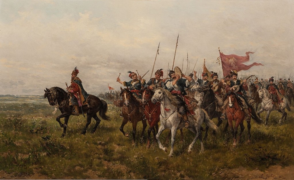 Na pierwszy rzut oka kompozycja Gędłka nie jest jednak oryginalna i stąd bierze się jej ‘inność’ w stosunku do wielu jego innych prac. Jest to pastisz dużej pracy Józefa Brandta ‘Powitanie stepu’ (fot ponizej) namalowanej w odbiciu lustrzanym. Występują oczywiście spore róznice kompozycji choć u Bradta ten dzień wygląda radośnie i uroczyśnie a pogoda temu sprzyja zaś u Gędłka miało byc radośnie a wyszło smutnie i nijako w szary dzień.