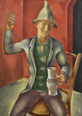 Lot 21. Eugene Zak (Polish, 1884-1926). Le buveur, signed ‘Eug. Zak’ (lower right), oil on canvas, 91.5 x 85.4cm (36 x 33 5/8in). Painted in 1924. Bonhams 2 luty 2014. PROVENANCE Dr. Herbert Tannenbaum, Amsterdam. Acquired from the above by the parents of the present owner, circa 1940s. By descent to the present owner. EXHIBITED: Paris, Salon des Tuileries, Le grand succès des artistes Polonnais, 1924, no. 94.LITERATURE: ‘Salon des Tuileries, Das pariser gegenstuck zu grosser berliner Kunstausstellung’, Bilder Courier, 1924, no. 94 (illustrated p. 3). Nouvelles, 1924, no. 29 VI. M. Kasterska, ‘Wystawy Paryskie, Salon w Tuileries i Wystawa polska’, Swiat, 1924, no. 32 (illustrated p. 4). H. Martinie, ‘Auslandescher Maler in Paris’, Der Cicerone, 1924, vol. 16 (illustrated p. 1123). R. Rey, ‘Salon des Tuileries’, Le Crapouillot, 1924, no. 1 VII (illustrated p. 24). M. Osborn, ‘Maler Eugen Zak’, Deutsche Kunst und Dekoration, 1924-1925, vol. 55 (illustrated p. 330). ‘Salon des Tuileries, w Paryzu. Wielki sukces artystow polskich’, Ilustracja, 1925, no. 1 (illustrated p. 5). ‘Z tworczosci swiezo zmarlego artysty Eugeniusza Zaka’, Kurier Poranny, 1926, no. z (illustrated p. 31). Sztuki Piekne, 1933, vol. 9 (illustrated p. 284). B. Brus-Malinowska, Eugeniusz Zak 1884-1926, Warsaw, 2004, no. 239 (illustrated p. 169). Executed in 1924 just two years before the sudden death of the artist, Le buveur is a compelling example from Eugene Zak’s mature oeuvre. In the years following the end of the First World War, Zak’s painting developed a more nostalgic and melancholic tone. From 1917 Zak began to move from his earlier repertoire of idyllic and Arcadian scenes populated by shepherds and fishermen, towards a preoccupation with representing ‘outsider’ figures in claustrophobic interiors or flat, empty space.Returning to settle in Paris from Poland in 1923, Zak drew upon the sombre themes and subjects of Picasso’s Blue and Rose period, as well as the general melancholic sentiment which pervaded the work of many European artists in the decades following the Great War. Zak’s protagonists were the actors, musicians, drunkards and vagabonds who usually inhabited the fringes of society, and his portraits of these figures sought to foreground their plight and isolation.Clutching a wine jug of traditional Polish porcelain and raising his hand in a toast, the expression of the subject in Le buveur belies the joyful the intent of the gesture. This solitary drinker assumes a doleful air, a wry smile coupled with vacant eyes which convey the glazed look of an intoxicated man lost in a fantasy world. In accordance with other compositions from this period Zak directs all the viewer’s attention to that of his usually marginalised protagonist, setting him in what appears to be an empty stage rather than a twentieth century saloon so as to further heighten the sense of alienation and escapism.