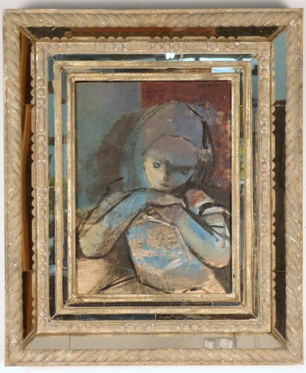 On canvas board, girl with music box, sur, 15 1/2″ H X 11″ W (26″ X 22″ mirrored and carved frame)