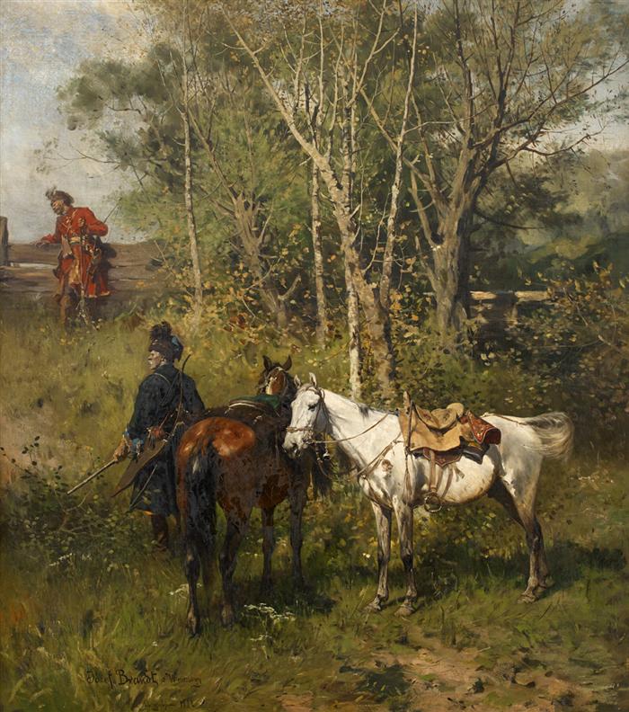 Lot 138. JOSEF VON BRANDT (Polish 1841-1915). ON THE LOOKOUT. Signed, dated and located ‘Jozef Brandt 1881 Warszawy Monachium’ bottom left; with Parrish Art Museum label (detached), oil on canvas, 39 3/8 x 35 in. (100 x 88.9cm). Provenance: The Estate of Ernestyna Schenker, New York, New York. Estimate $70,000-100,000. Freeman’s, 28 stycznia 2013. [Sprzedano za $110.000]