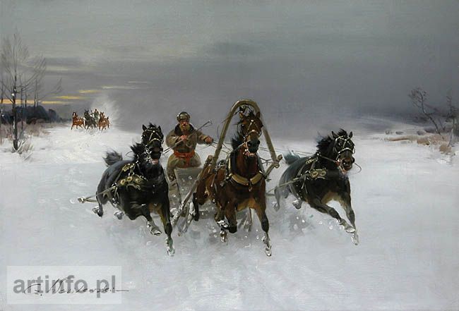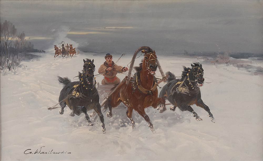 Los 4044. Wasilewski, Czeslaw: Wilde Troika-Fahrt im Winter. Öl/Leinwand, links unten signiert. Zwei Schlitten in voller Fahrt durch eine weite, verschneite Ebene Russlands unter einem grau bedeckten Himmel und zwischen kahlen Bäumen und Büschen. 48 x 78 cm, rot-goldener Rahmen 62 x 91 cm. Eigentlich: Ignacy Zygmuntowicz, polnischer Maler (1875 Warschau – 1947 Lodz). Limitpreis 900 euro. Auktionshaus Wendl. 06/03/2014 – 08/03/2014.