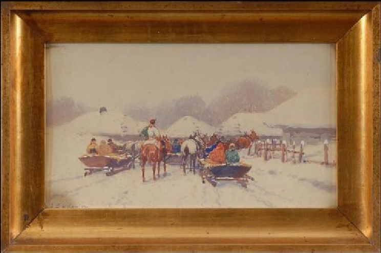 Lot No. 3943. Setkowicz, Adam: Zwei Winterlandschaften mit Schlitten. Je Aquarell, weiß gehöht, je links unten signiert, verso 1x auf Etikett bezeichnet. Viele Menschen in den Schlitten auf der verschneiten Dorfstraße bzw. Drei Männer im Gespräch nahe dem Schlitten bei den Häusern im verschneiten Dorf. Je leicht stockfleckig. 26 x 46 cm bzw. 16 x 31 cm, je verglaster Goldrahmen 39 x 59 cm bzw. 25 x 40 cm. Polnischer Maler (1876 Krakau – 1945), studierte bei Axentowicza und J. Majteki. Auktionshaus Wend. Reserve price 390 €. 06/03/2014 – 08/03/2014.