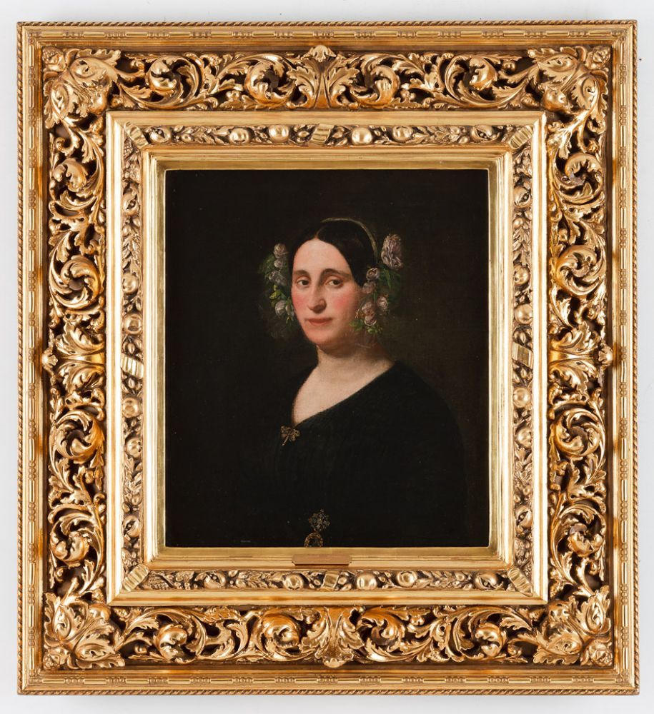 Los 253. STATTLER, WOJCIEH KORNELI 1800 Krakau – Warschau 1875, (zugesch.) Portrait einer Edeldame. Öl auf Leinwand (doubl.), 65 cm x 53 cm, verso auf dem Rahmen altes Etikett, handschriftlich, part. unleserlich, bez. ‘N. 755e Stattler […?]Kobiety (?)’. Hargesheimer Kunstauktionen Düsseldorf. 15/03/2014. Reserve 1,800 €.