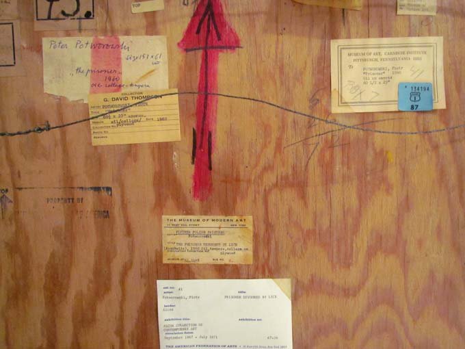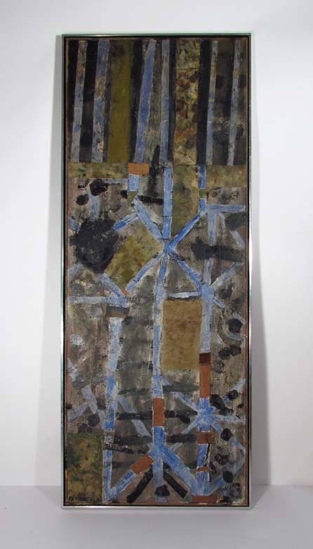 Potworowski, Tadeusz Piotr (Polish 1898 – 1962). Prisoner Devoured by Lice, 1960, oil, tempera, yarn stitching, collage on wood, 61.5 x 24 inches. Exhibited: The Museum of Modern Art, New York “Fifteen Polish Painters” 1960; The Minneapolis Institute of Arts loaned by MOMA; The G. David Thompson Collection; An Exhibition of Works Acquired from the G. David Thompson Collection by Alcoa The American federation of the Arts Travelling Exhibition from the Alcoa Collection September 1967-July 1971, Alcoa Collection; WQED Television Art Auction, circa 1980; an interesting abstract expressionist treatment of the surface featuring collage elements in the European modernist style reminicent of Alberto Burri; signed Potworowski lower left and signed on attached paper labels on reverse. Provenance: G. David Thompson, Pittsburgh Pa. ; ALCOA Corporate Collection; WQED television Art Auction circa 1980; purchased by the current owner from the WQED Auctionwelded corner Alcoa Made ; aluminum frame measuring 62.5 x 25 inches