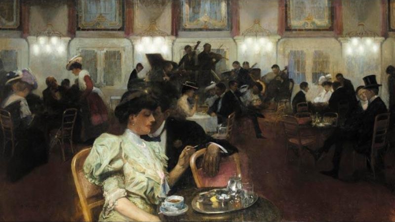 AU CAFÉ CONCERT, signed and dated A. Karpinski 1907 l.l., oil on canvas, 113 by 197.5cm., 44 1/2 by 77 3/4 in., sold 38,400 GBP . Sotheby’s 15 June 2004