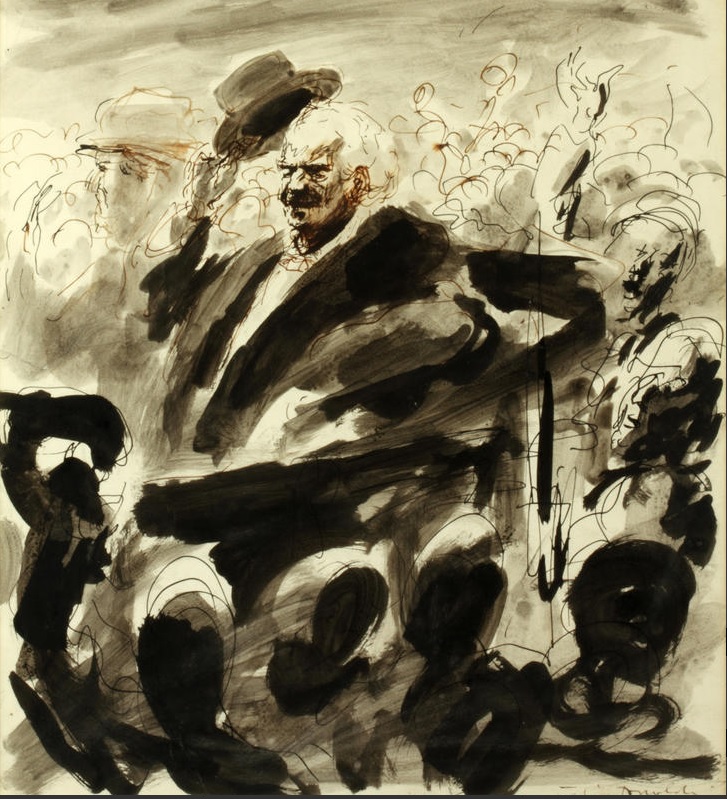 Bardziej znany w Anglii niż w Polsce. Próby przebicia się jego prac, głównie rysunków, na rynkach aukcyjnych w Polsce są mizerne. Rzadko jego prace są wyceniane powyżej 1,000 złotych a i tak popyt jest mikry. W Anglii natomiast często pojawiają się produkty jego ręki i to w bardzo dobrych domach aukcyjnych. Tym razem Bonhams wystawił sporej wielkością pracę przedstawiającą Lloyd-Georga jadącego dorożką wśród wiwatujących tłumów. Moim pierwszym wrażeniem był Ignacy Jan Paderewski przejeżdżający przez Krakowskie Przedmieście w Warszawie ale podobno na odwrociu papieru jest nieszczęsny opis autorski. Paderewskiego może bym kupił ale Lloyd-Georg niech wisi u Anglików.
