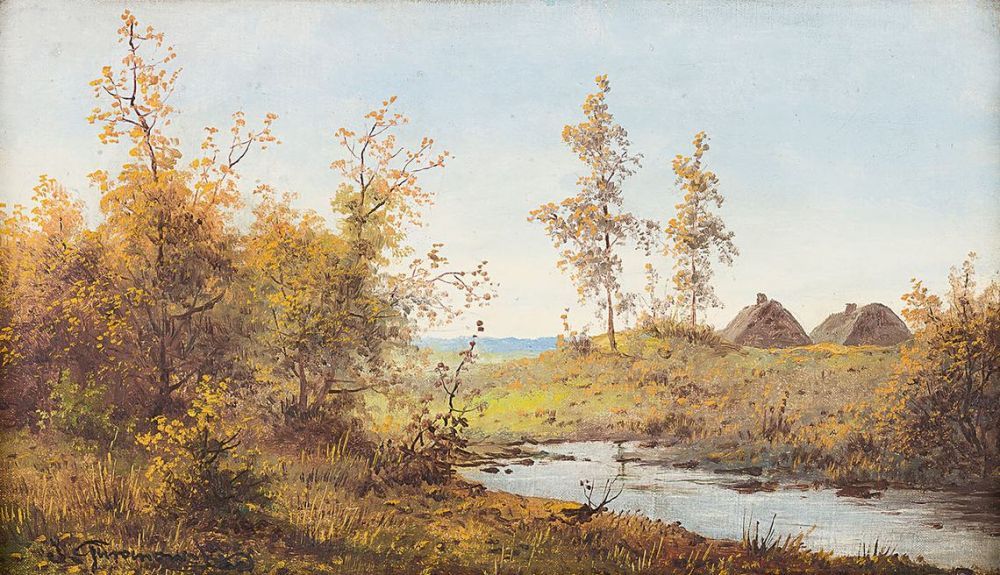 Józef Guranowski. Spätsommerliche Landschaft mit Brandweiher und zwei strohbedeckten Gehöften