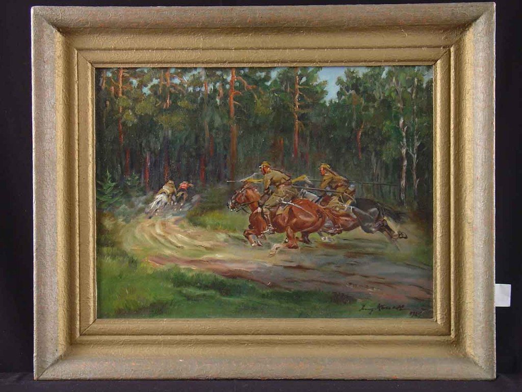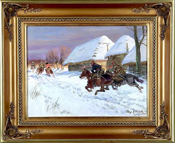 Nierozpoznany u Bergmanna z sygnatury J. Konarski vel Konarsky. Namiastka Wierusza dla tych co kochają monachijską szkołe jazdy. Raz jeszcze: to nie jest Alfred Wiersz-Kowalski. Uważa się, że malarzem był Franciszek Bujakiewicz.
