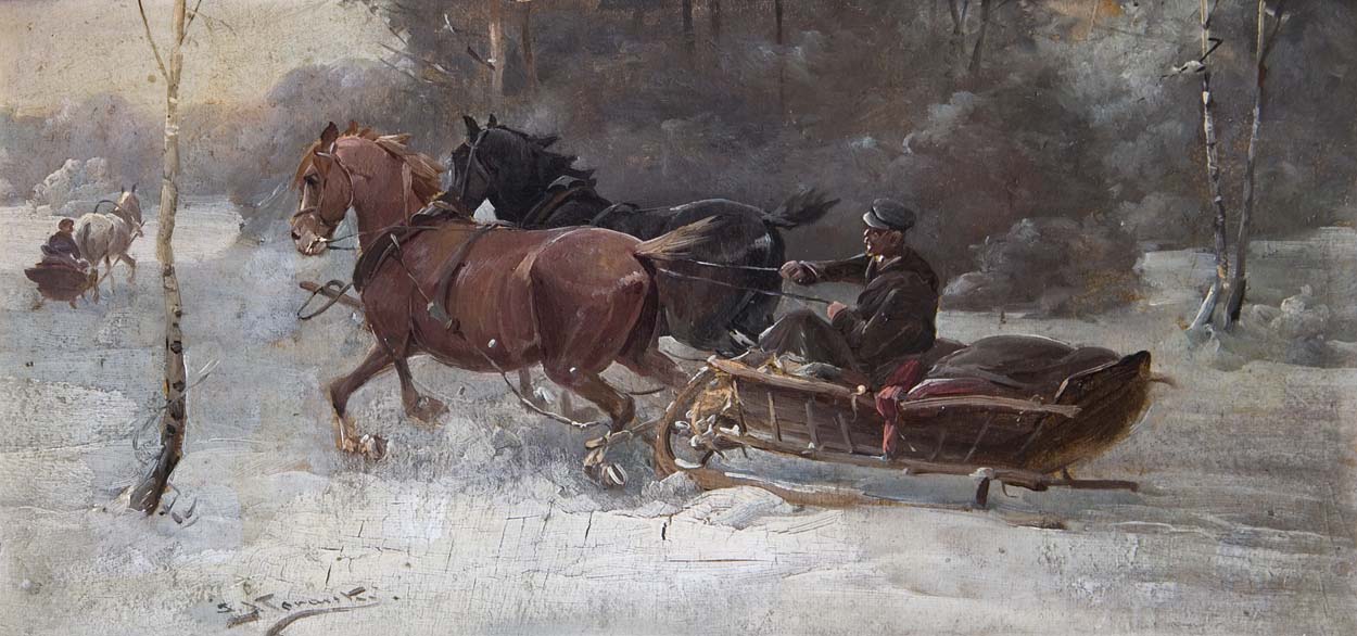 KASPROWICZ, JAN MAKSYMILIAN. 1906 Schwersenz – Gdingen 1986, polnischer Maler. Schlittenfahrt mit Troika Öl auf Leinwand, 60,5 cm x 101 cm, unten rechts signiert ‘J. M. Kasprowicz’, Rahmen. KASPROWICZ, JAN MAKSYMILIAN 1906 Schwersenz – Gdingen 1986, (polish artist). Troika Oil on canvas, 60,5 cm x 101 cm, signed lower right ‘J. M. Kasprowicz’, frame. Limitpreis 480 €. Hargesheimer Kunstauktionen. Düsseldorf. 05/04/2014.