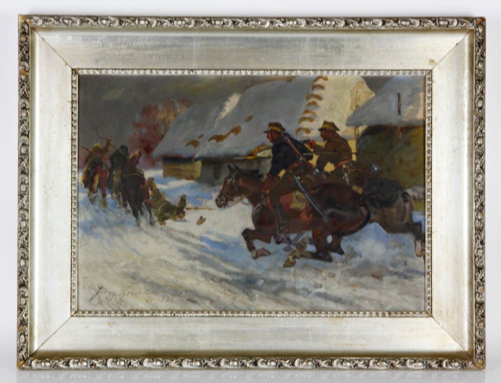Lot 1016. Jerzy Kossak (1886-1955), Police chasing horse bandits, oil on masonite, signed and dated 1930 lower left, also signed verso, 13 1/2″ h x 19 1/2″ w (view), 19″ h x 25″ w (frame). Provenance: From a Marblehead, MA estate. Estimate $800-1,200. Kaminski Fine Art. March 22, 2014.[Sprzedano za $2,000].