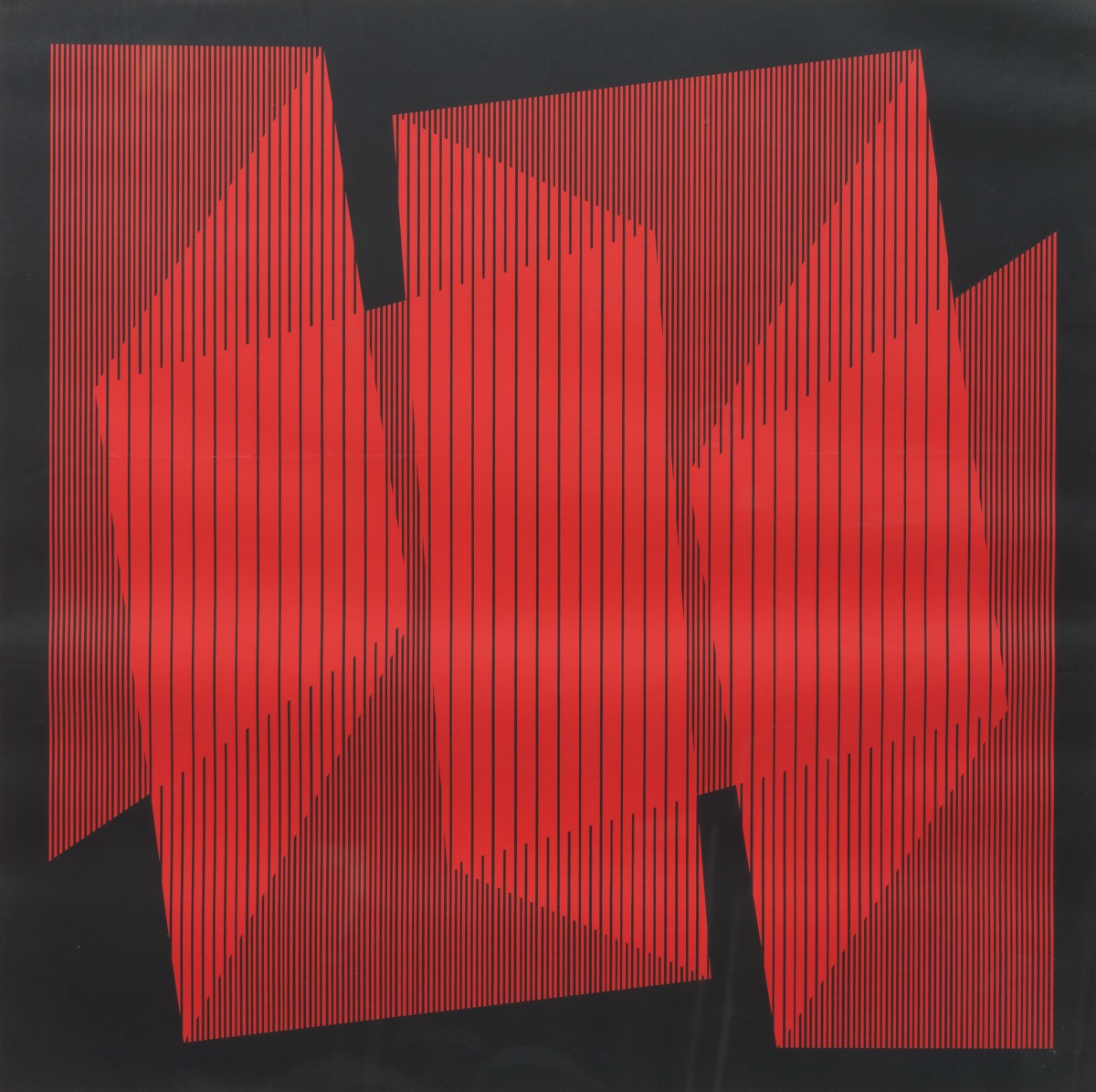 Lot 59. “Red Cut-Out“. 24⅜ x 24⅜ in. Screenprint on paper, signed in the lower right margin, numbered 95/165 in the lower left margin, framed under glass overall 29-1/4 x 29 in. Blind stamped at the lower right corner of the paper and one at the lower left corner of the paper and upper left corner. Paper size 28-1/8 x 27-7/8 in.