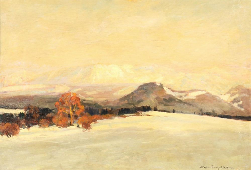 Zimowy pejzaż Stefana Filipkiewicza; prawdopodobnie Beskidy. Znając trochę paletę tego malarza myśle sobię, że te żółcie na płótnie to efekt utlenionego werniksu po zmyciu którego powinny pojawić się biele śniegu. Obraz pewnie z późnych lat 20-tych lub 30-tych.