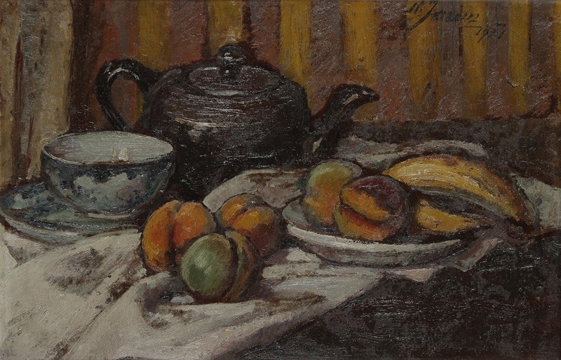 Lot 139. Roman JAROSZ (1889-1932). Nature morte, 1921. Huile sur carton. Signée et datée en haut à droite. 25,5 x 38,5 cm. Estimation : 1 000 € / 1 200 €.