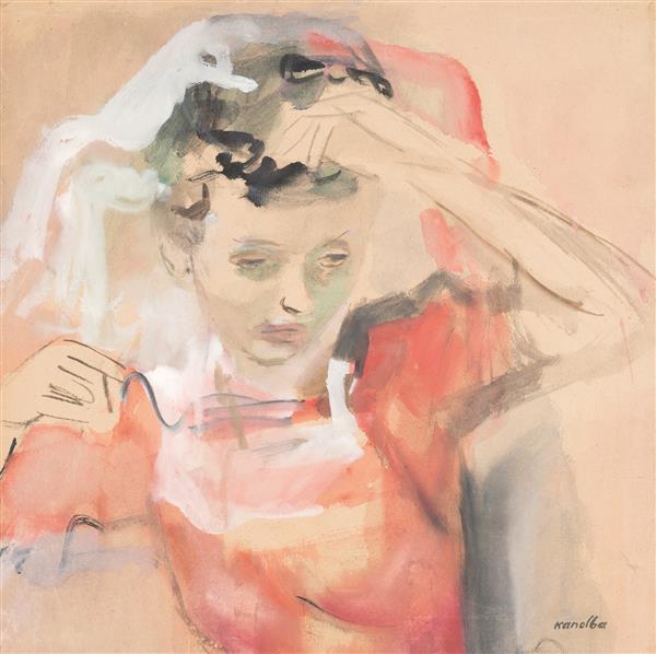 Lot 247. Raymond Kanelba (1897-1960) La dame en rouge. Aquarelle sur papier Signée en haut à droite 62 x 62cm. Estimation : € 1,000-1,500,