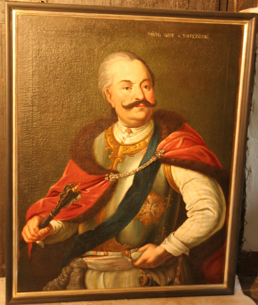 Oil on canvas, (backed, new stretcher). The back was originally covered with a second canvas, also included separately, on which the handwritten, contemporary Latin script identifies the subject of the painting, Suffczynski, as Lord of Czersk and bearer of the Order of the White Eagle, and names the artist as the electoral Bavarian court painter Franz Ignaz Oefele, together with the date May 1773 (Suffczynski’s year of birth is here incorrectly given as 1715). Half-length portrait in one-quarter profile. The subject is portrayed with a moustache and grey hair, wearing a partially gilt breastplate with the breast star of the Order of the White Eagle (inscription appears to read “Pro Fide, Rege et Lege” – “For Faith, King and Law”), a blue sash and fur-trimmed cloak, holding a mace in his right hand. Slightly damaged, signs of age. Size of the painting circa 100 x 85 cm, size of the old canvas backing circa 100 x 90 cm. Awarded the Order of the White Eagle in 1759, the Polish nobleman Michael Suffczynski was involved in the election of Stanislaus II August Poniatowski (1732 – 1798) as King of Poland in 1764 and went into exile in Munich as of 1772, where this portrait was painted one year later (source: Polski Slownik Biograficzny, edited by K. Kuras). According to the Dictionary of Artists by Emmanuel Bénézit, there existed two contemporary versions of this portrait. Franz Ignaz Oefele was the electoral court painter and artistic director of the Academy of Fine Arts in Munich. He achieved renown due to numerous paintings commissioned by the church, including Munich’s Theatinerkirche (Theatine Church).