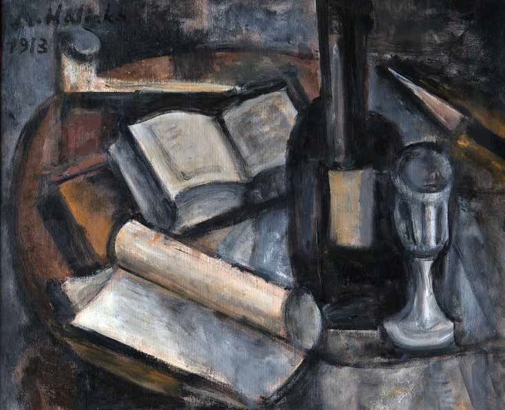 Lot 7. Alice Halicka (1895-1975). Still life with an open book, bottle, paper roll and knife. Oil on canvas signed and dated on the upper lieft side, 1913. 19 11/16 x 23 5/8 in. 10 000 / 15 000 €. Exhibition. Vichy, 1988, cat.3. Certified upon a photograph by Alice Halicka.