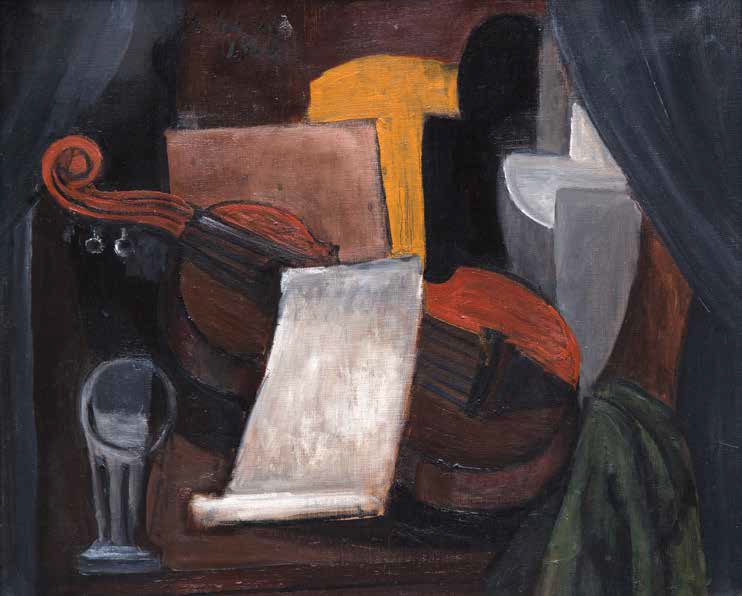 Lot 9. Alice Halicka (1895-1975). Cubist composition with layed violin, glass and sheet ofpaper. Oil on canvas dated on the upper left side 1918; 19 11/16 x 24 in. 10 000 / 12 000 €. Certified upon a photograph by Alice Halicka.