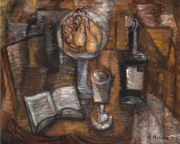 Lot 7. Alice Halicka (1895-1975). Still life with an open book, bottle, paper roll and knife. Oil on canvas signed and dated on the upper lieft side, 1913. 19 11/16 x 23 5/8 in. 10 000 / 15 000 €. Exhibition. Vichy, 1988, cat.3. Certified upon a photograph by Alice Halicka.