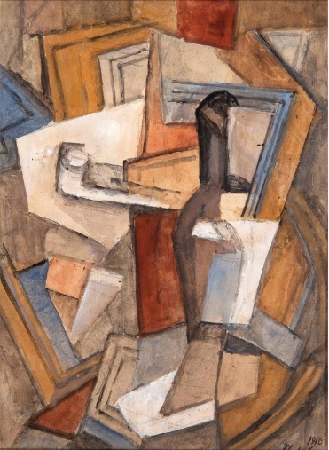 Lot 27. Alice Halicka (1895-1975). Cubist composition, bottle, pipe and pen case. Watercolour on paper signed on the upper left side.6 1/4 x 7 7/8 in. 1 500 / 2 000 €. Exhibition. Vichy 1988, cat.39