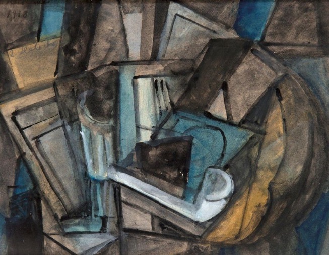 Lot 26. Alice Halicka (1895-1975). Cubist composition, glass, pipe and book on a pedestal table. Watercolour on paper signed and dated on the upper leftside 1918, resigned in lad pencil.7 7/8 x 10 in. 1 500 / 2 000 €. Exhibition Vichy 1988, cat.36.