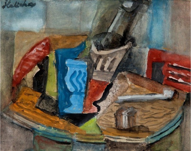 Lot 27. Alice Halicka (1895-1975). Cubist composition, bottle, pipe and pen case. Watercolour on paper signed on the upper left side.6 1/4 x 7 7/8 in. 1 500 / 2 000 €. Exhibition. Vichy 1988, cat.39