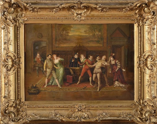 Lot 123. BAKALOWICZ Ladislaus (1833-1903). Huile sur toile “Le duel”. Signé en bas à droite L. Bakalowicz. Ecole polonaise. Dim.:66.5x93cm. Estimation : 2000 € – 3000 €.