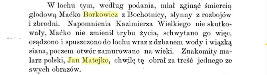 Serdecznie dziękuję za wpis i informację o obrazie Maćko Borkowic, ale muszę Pana zmartwić gdyż jest to tylko kopia nie zbyt udana i nieporadna z początku XX wieku. Obraz oryginalny nie jest zaginiony ale jest w rękach prywatnych i miałem możność widzenia tego obrazu w 1993 roku na wystawie w Warszawie i który się różni stylem malowania oraz opracowaniem szczegółów i twarzy od tego, co Pan przesłał. Przesyłam linki do dwóch fotografii jednej czarnobiałej a drugiej kolorowej, choć ta ostatnia nie jest zbyt dobra, ale widać na obu i porównując z tą kopią, że się różni, chociaż by układem samego ciała, Borkowica który jest u Matejki bardziej nachylony do przodu na kopi w drugą stronę. Sama podobizna twarzy jest inna oraz dłoń spierająca się na ramie otworu wejściowego jest za duża u Matejki jest mniejsza i proporcjonalna w stosunku do twarzy. Fałdy płaszcza, które spierają się na nodze maja inną formę i układ niż widoczne u Matejki oraz kieszeń na płaszczu też ma inny kierunek u Matejki bardziej góra nachylona w lewo. Widoczny wzór na pokrywie włazu u Matejki jest cały i jest 5 tych okręgów a na kopi ostatni widoczny na dole jest połówką zresztą cała ta klapa na Matejki obrazie jest bardziej prostokątna a na kopii kwadrat. To samo tyczy się mężczyzny stojącego za pokrywą włazu w niebieskim płaszczu, który to jego płaszcz jest cały niebieski a na kopii zawinięta część zielona. Oraz ten wzór i frędzelki na kopi są jakieś naiwne u Matejki jest to bardziej naturalne i spontaniczne. Ogólnie rzecz biorąc Matejkowski obraz jest bardziej spontaniczny, co widać gołym okiem sama technika jest zupełnie inna. Sygnatura też nie jest Matejkowską. Gdy popatrzyłem na ten obraz, który pan przesłał od razu stwierdziłem, że to nie Matejko tylko kopia. Jeszcze raz dziękuję, bo jak by nie było jest to ciekawostka byle by się ktoś nie naciął kupując to, jako oryginał. Pozdrawiam.