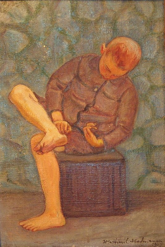 Lot 471. Hofmann, Wlastimil (Prag 1881 – 1970 Krakau): Knabe einen Dorn aus dem Fuß ziehend 1927 Öl auf Leinwand auf Pappe, rechts unten voll sign. und dat., leicht wellig, rückseitig Echtheitsexpertise, Ausfuhrgenehmigung und zahlreiche Auktionsnummern, 22 x 31 cm, Rahmen. Reserve 200 €.