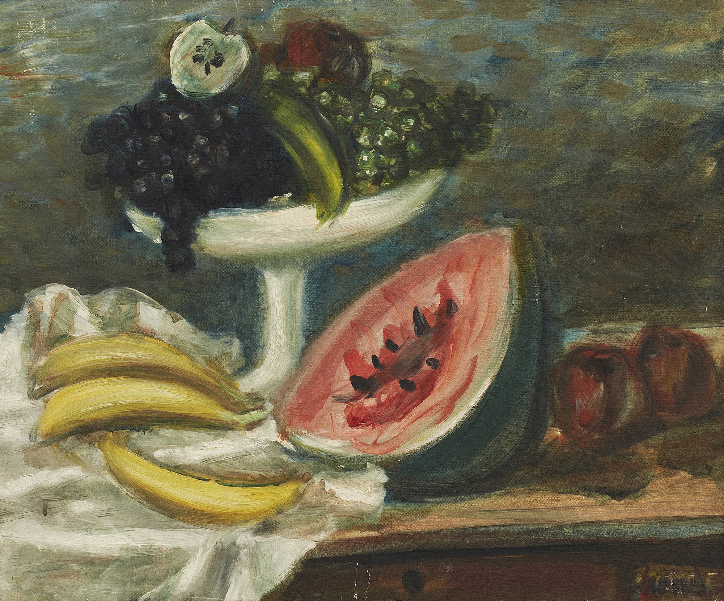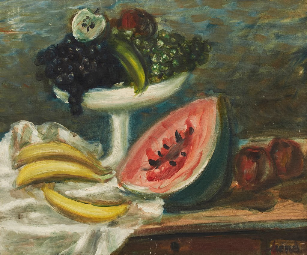 Lot 803. Zygmunt Menkes Polen 1896‑1986. Martwa natura z bananów i melona. Signed Menkes. Oil on canvas, 46 x 55 cm. Proveniens: Läkaren och konstsamlaren Marcus Diamant (1898‑1989). Estimate: SEK 20.000 – 30.000 (EUR 2.200 – 3.300).