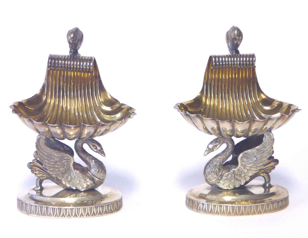 Lot 5018. Zwei prächtige Muschel – Salièren Warschau. Zwei von plastisch gearbeiteten Schwänen getragene, muschelförmige Schalen, jeweils bekrönt von einem plastischen Papagei. 12-lötiges Silber, die Schalen innen vergoldet. Am Boden punziert „Malcz“ für Karol Filip Malcz, geboren 1797, gestorben 1867, tätig als Goldschmied in Warschau. Vgl. Rosenberg, Bd. IV, Nr. 8022. Höhe: ca. 13 cm, Gesamtgewicht: ca. 505 g. Reserve 300 €.