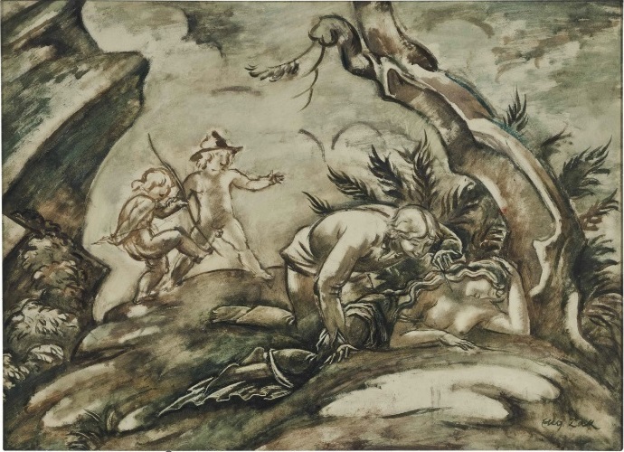 Lot 84. Eugène Zak (Polish, 1884-1926). Le couple; signed ‘Eug. Zak’ (lower right); gouache, watercolor and wash on paper laid down on board; 19 1/8 x 26 1/8 in. (48.6 x 66.4 cm.). Estimate $5,000 – $7,000.