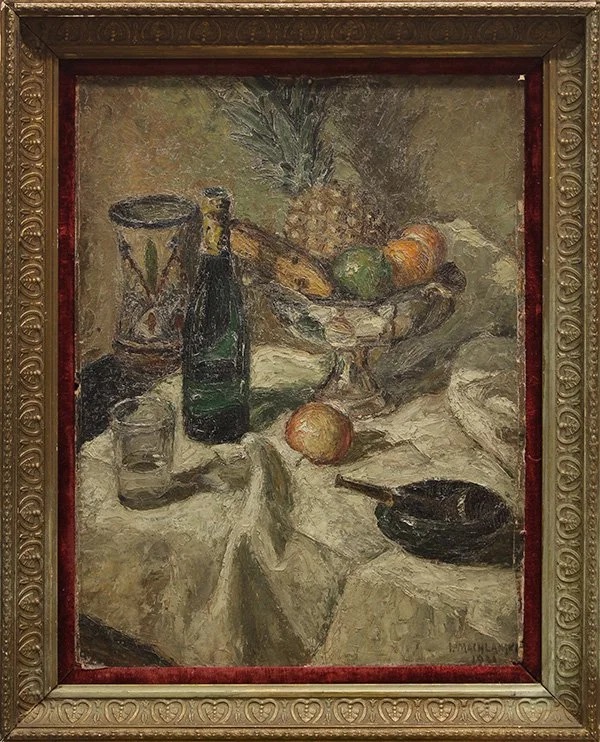 Lot 4631. Ignacy Machlanski (Polish/American, 20th century), Still Life with Fruit, Bottle, Pipe and Waterglass, 1933, oil on board, signed and dated lower right, overall (with frame): 29”h x 23”w. Estimate $100 – $200.