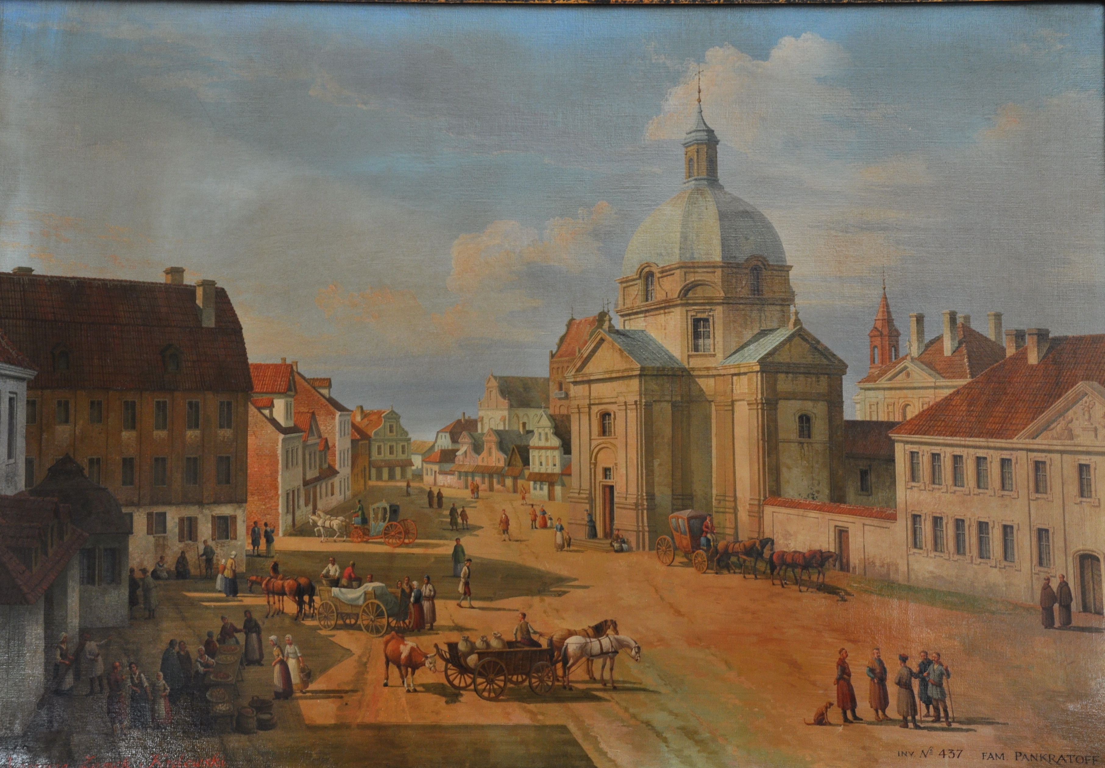 Obraz ten, przedstawiający Rynek Nowego Miasta wWarszawie z widokiem na Kościól Sióstr Sakramentek opisany jest w sposób kaligraficzny czerwoną farbą w lewym dolnym rogu jako ‘Varsavia Zamek Królewski’ (przez o z kreską) i w podobny sposób obraz został opisany w katalogu firmy niemieckiej. W prawym dolnym rogu znajduje się z kolei napis czarnąfarbą ‘INV No 437 FAM. PANKRATOFF’. Firma niemiecka wzbrania sie z udostępnieniem fotografii tylniej strony obrazu tlumacząc mi, że fotografii odwrotnej strony nie mają. To jest trochę tłumaczenie pokrętne bo nic nie stoi na przeszkodzie by odwrócic obraz i pstryknąć zdjęcie. Trzy razy prosiłem i trzy różne wykręty mnie spotkały. Dlaczego o tym piszę z taką drobiazgowością? Dlatego, że z wyglądu płótna od strony drugej można wiele się dowiedzieć i o kondycji samego płótna, jak też i wieku obrazu a czasami znajdują się tam nalepki i stemple jakie z kolei mogą coś dodać o historii wystawienniczej lub podać informacje o poprzednich właścicielach. W tym przypadku interesował mnie wiek płótna i zaraz to wytłumacze dlaczego.