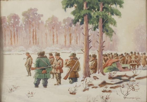Lot 3500782. M. Szczerbinski, Polish, 1900-1981, Winter Hunting party, watercolor, signed. Estimate $200-400. Measurements 19 x 27, framed 27 x 33 inches. Starting bid $ 130.