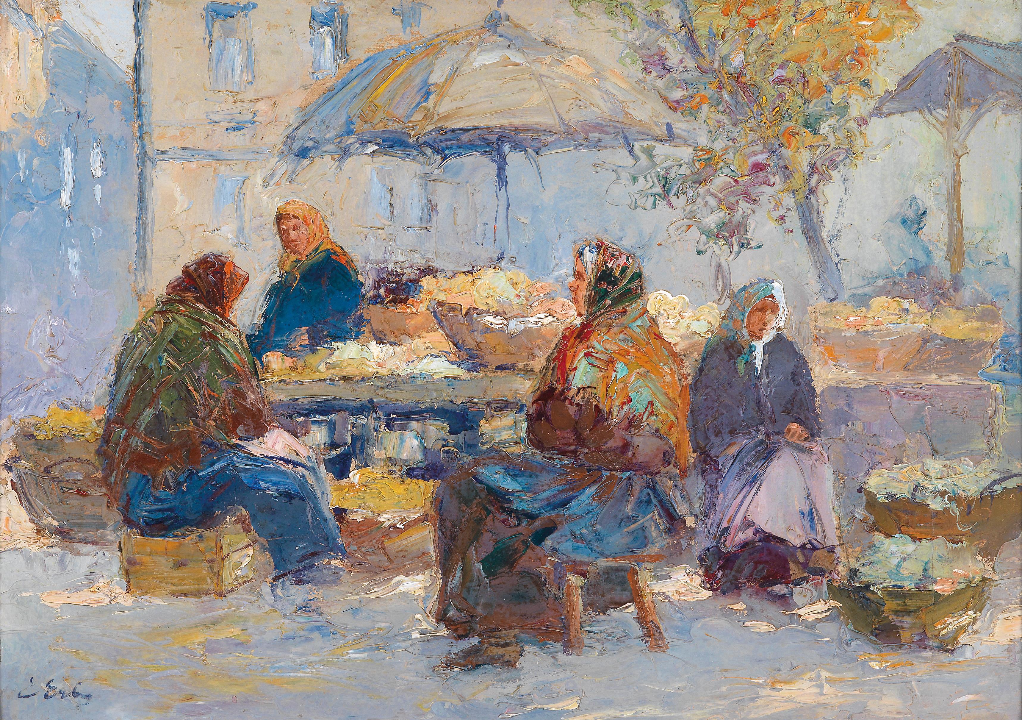 Lot No. 143. Erno Erb (Lviv 1878-1943) Market Scene, signed E. Erb, oil on board, 35 x 39 cm. Estimate EUR 1,400 to 1,800.