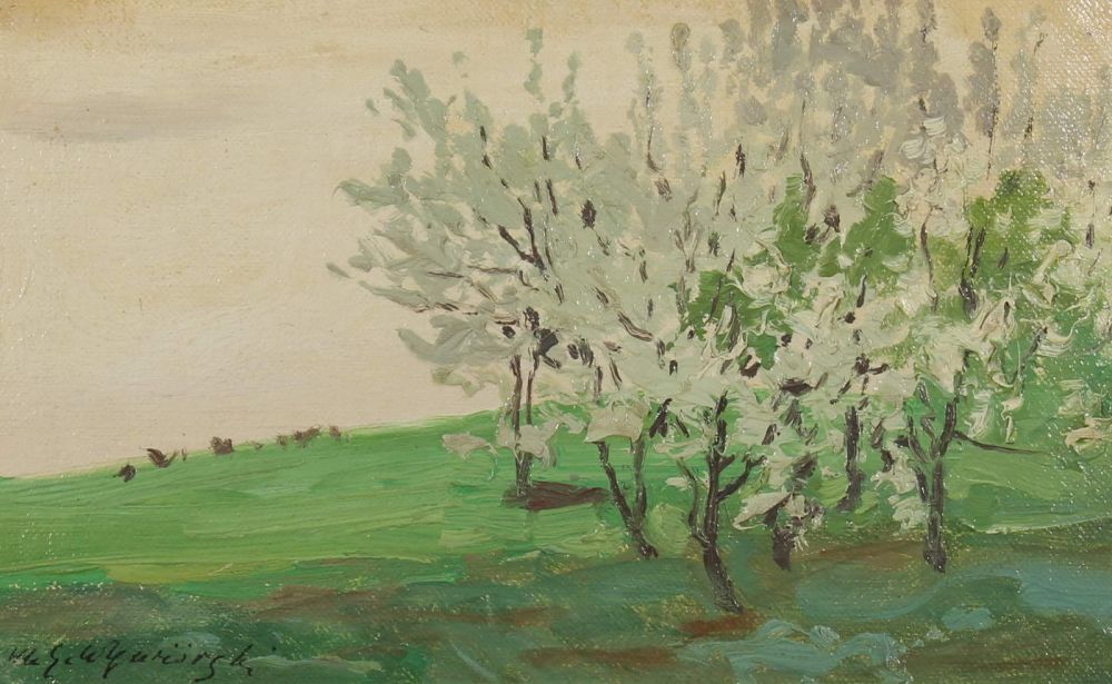 Lot 1509. Wywiorski, Michael Gorstkin (1861 Warschau – 1926, Studium an der KA München, Landschafts- und Genremaler), “Blühende Obstbäume”, Öl auf Leinwand, auf Karton, signiert unten links M.G. Wywiorski, 19 x 29 cm.