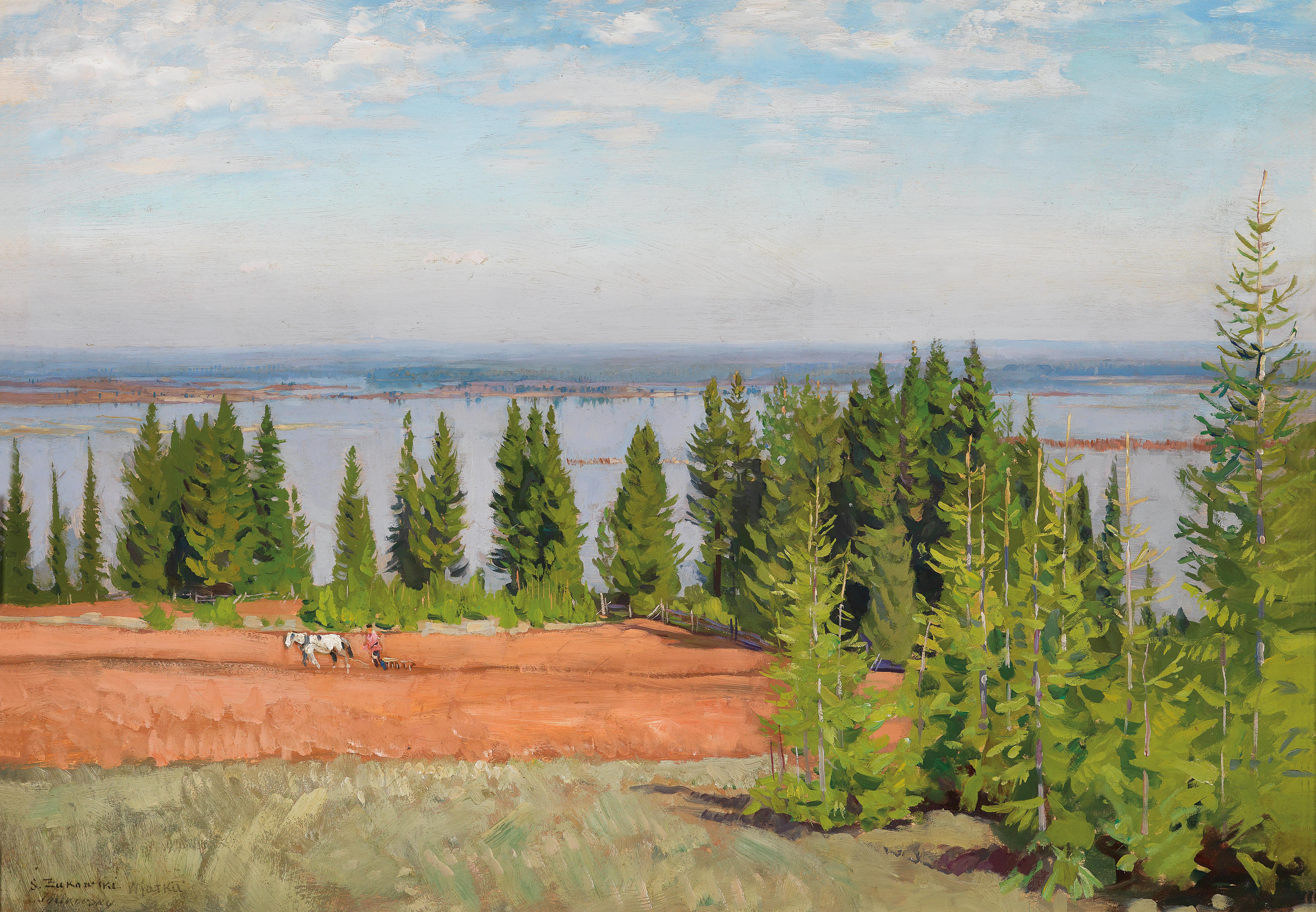 ZHUKOVSKY, STANISLAV (1875-1944). River Vyatka,signed twice, inscribed “Wiatka” (oil on canvas, 64.5 by 91 cm) and dated 1928, also further signed and inscribed on the reverse. 55,000-70,000 GBP. Authenticity of the work has been confirmed by the expert V. Petrov.