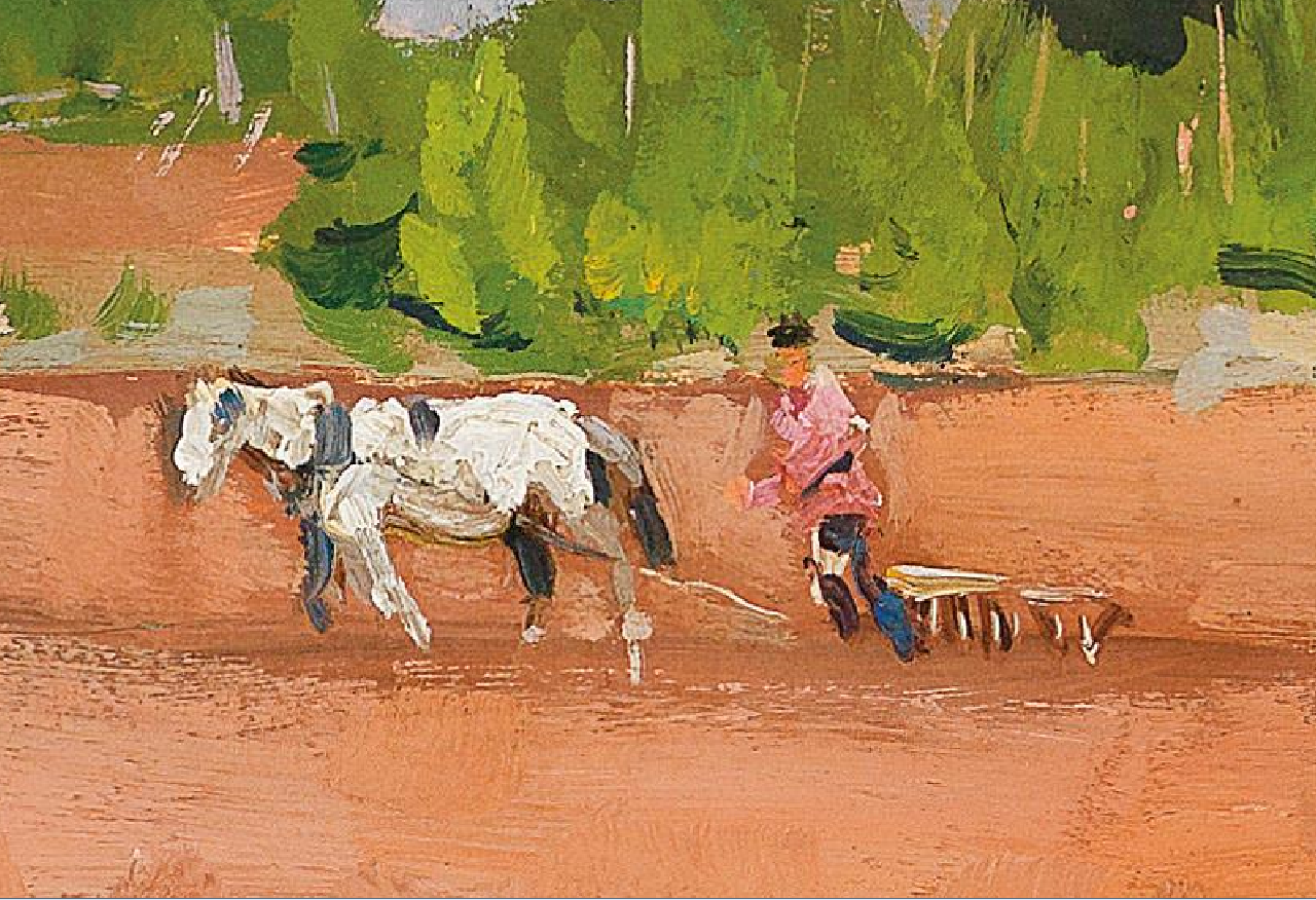 On the River Vjatka, signed, dated and inscribed Joukovski Wjatka 1928, signed again later Zukowski, on the reverse signed and inscribed, oil on canvas, 64.5 x 91 cm, framed (frame severely damaged). The French transcription of his name was the result of his frequent exhibits in France. He later changed the transcription of his name. Two comparable monumental panoramic views of Vjatka are described in the Zhukovsky monograph by Mikhail I. Gorelov (Moscow 1982, catalogue p. 257, ill. 119 and 120). They are held by the Mikhail Glinka-Museum in Moscow and a private St. Petersburg collection. Estimate 35,000-45,000 euro.
