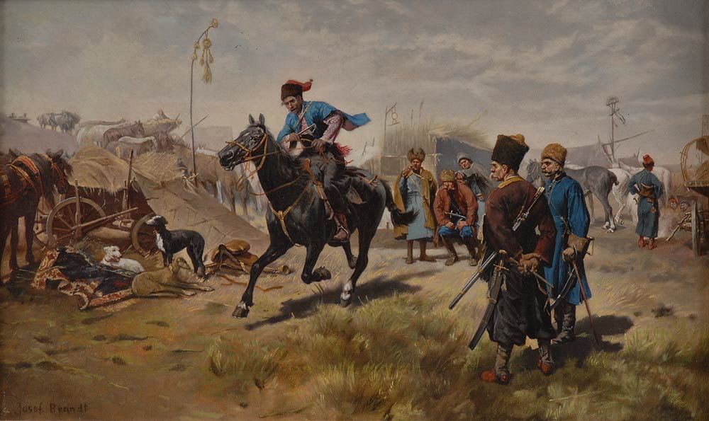 Lot 4164. Brandt, Josef von: Reiter im Kosakenlager. Öl/Leinwand, links unten signiert, verso auf Keilrahmen teils unleserlicher Vermerk des Malers über die Comtesse Schaffgotsch vom 5. Juli 1898. Reiter auf schwarzem Pferd im großen Lager der Kosaken die in Grüppchen stehend sich unterhalten oder dem Reiter nachschauen. Leinwand doubliert. 29 x 47 cm, Goldstuckrahmen 41 x 59 cm. Th/B.: Polnischer Historienmaler (1841 Szczebrzeszyn – 1915 Radom), studierte zuerst an der École centrale in Paris, später dann Malerei in München unter Adam und Piloty. ABB.B 258. Limit 6,500 €. Wendl. 10/23/14.