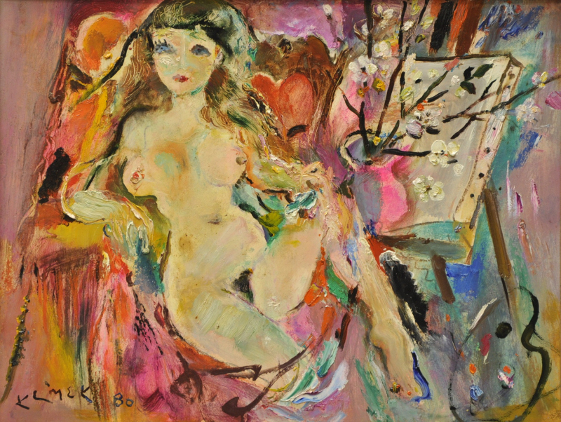 Obraz Klimka widocznie bardzo podoba się obecnemu właścicielowi i stąd pewnie taka nierealna wycena. Rzeczywiście, bardzo dobra to praca, uroczy akt. Klimek (ten to miał życie!) swoim pędzlem stwarza wrażenie naturalności sytuacji i niewinności modelki (bredzenie zazdrośnika).