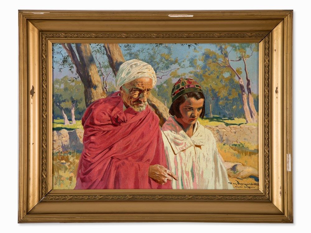 This painting by Feliks Michal Wygrzywalski depicts an old man in a red gown next to a young boy in a sunlit landscape. Deep wrinkles crisscross the wise face of the grandfather, who is instructing his grandson. Wygrzywalski followed the academic manner painting of the early 20th century. Nevertheless, the present work shows slight impressionist touches, for example in the loosely painted background or the color of the shadows. From 1906 to 1908, the Polish artist lived in Egypt, where he created numerous oriental motifs of this kind.