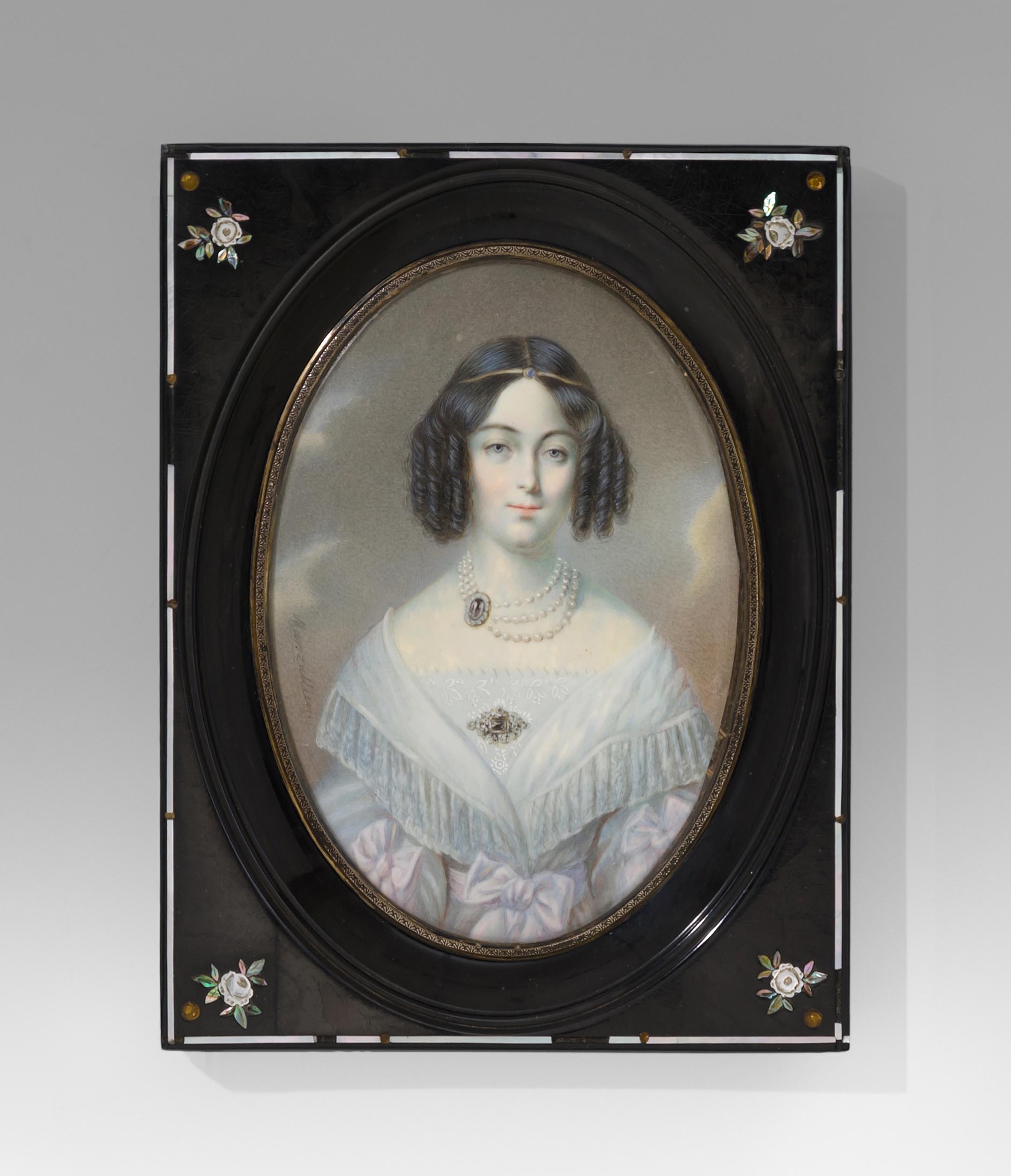 Lot 4217. Damenporträt. Polen, um 1840. Gouache auf Elfenbein, oval, signiert: Marszalkiewicz (Stanislaw Marszalkiewicz, Varsovie, 1789–1872). Junge Dame mit schwarzen Korkzieherlocken, in weissem Kleid mit tüll-gesäumtem Brusttuch und Perlencollier vor Himmelshintergrund. Gefasst. 7,8×11,4 cm. Starting Price : 600. Estimation 800-1,200 CHF. March 28th, 2015. Schuler.