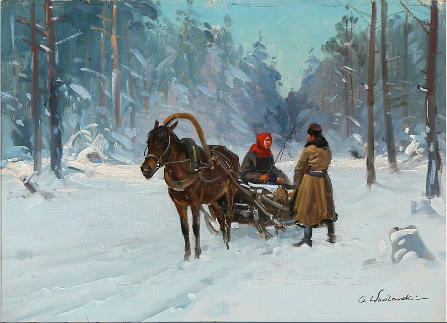 Druga z prac (Kirasjer w zadymce) ma piekną sygnaturę ale wierzba nie malowana przez Wojciecha a koń w jakies ciapki. Wojciechowi w większych pracach śnieg malował czasami Wywiórski ale to nie znaczy, że malarz nie potrafił malować śniegu. Tutaj nie ma śniegu, jest jedynie rozmazana biała farba. Rozpacz.